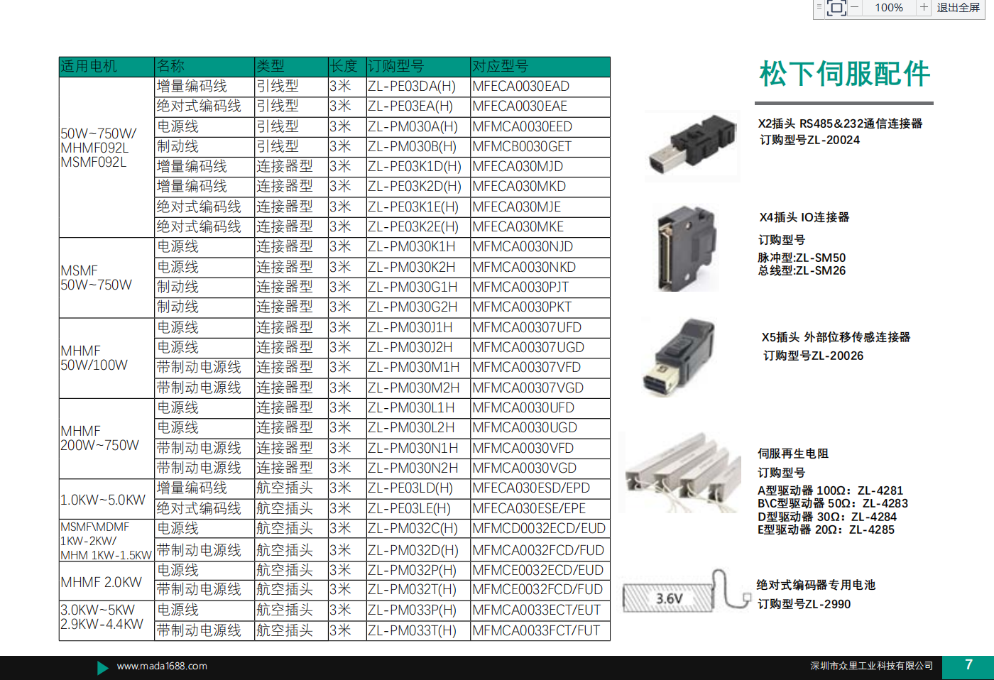适用电机 名称 类型 长度 订购型号 对应型号 50W~750W/ MHMF092L MSMF092L 增量编码线 引线型 3米 ZL-PE03DA(H) MFECA0030EAD 绝对式编码线 引线型 3米 ZL-PE03EA(H) MFECA0030EAE 电源线 引线型 3米 ZL-PM030A(H) MFMCA0030EED 制动线 引线型 3米 ZL-PM030B(H) MFMCB0030GET 增量编码线 连接器型 3米 ZL-PE03K1D(H) MFECA030MJD 增量编码线 连接器型 3米 ZL-PE03K2D(H) MFECA030MKD 绝对式编码线 连接器型 3米 ZL-PE03K1E(H) MFECA030MJE 绝对式编码线 连接器型 3米 ZL-PE03K2E(H) MFECA030MKE MSMF 50W~750W 电源线 连接器型 3米 ZL-PM030K1H MFMCA0030NJD 电源线 连接器型 3米 ZL-PM030K2H MFMCA0030NKD 制动线 连接器型 3米 ZL-PM030G1H MFMCA0030PJT 制动线 连接器型 3米 ZL-PM030G2H MFMCA0030PKT MHMF 50W/100W 电源线 连接器型 3米 ZL-PM030J1H MFMCA00307UFD 电源线 连接器型 3米 ZL-PM030J2H MFMCA00307UGD 带制动电源线 连接器型 3米 ZL-PM030M1H MFMCA00307VFD 带制动电源线 连接器型 3米 ZL-PM030M2H MFMCA00307VGD MHMF 200W~750W 电源线 连接器型 3米 ZL-PM030L1H MFMCA0030UFD 电源线 连接器型 3米 ZL-PM030L2H MFMCA0030UGD 带制动电源线 连接器型 3米 ZL-PM030N1H MFMCA0030VFD 带制动电源线 连接器型 3米 ZL-PM030N2H MFMCA0030VGD 1.0KW~5.0KW 增量编码线 航空插头 3米 ZL-PE03LD(H) MFECA030ESD/EPD 绝对式编码线 航空插头 3米 ZL-PE03LE(H) MFECA030ESE/EPE MSMF\MDMF 1KW-2KW/ MHM 1KW-1.5KW 电源线 航空插头 3米 ZL-PM032C(H) MFMCD0032ECD/EUD 带制动电源线 航空插头 3米 ZL-PM032D(H) MFMCA0032FCD/FUD MHMF 2.0KW 电源线 航空插头 3米 ZL-PM032P(H) MFMCE0032ECD/EUD 带制动电源线 航空插头 3米 ZL-PM032T(H) MFMCE0032FCD/FUD 3.0KW~5KW 2.9KW-4.4KW 电源线 航空插头 3米 ZL-PM033P(H) MFMCA0033ECT/EUT 带制动电源线 航空插头 3米 ZL-PM033T(H) MFMCA0033FCT/FUT